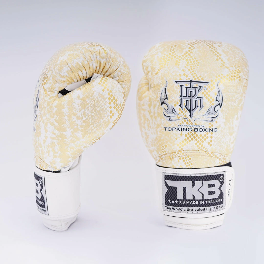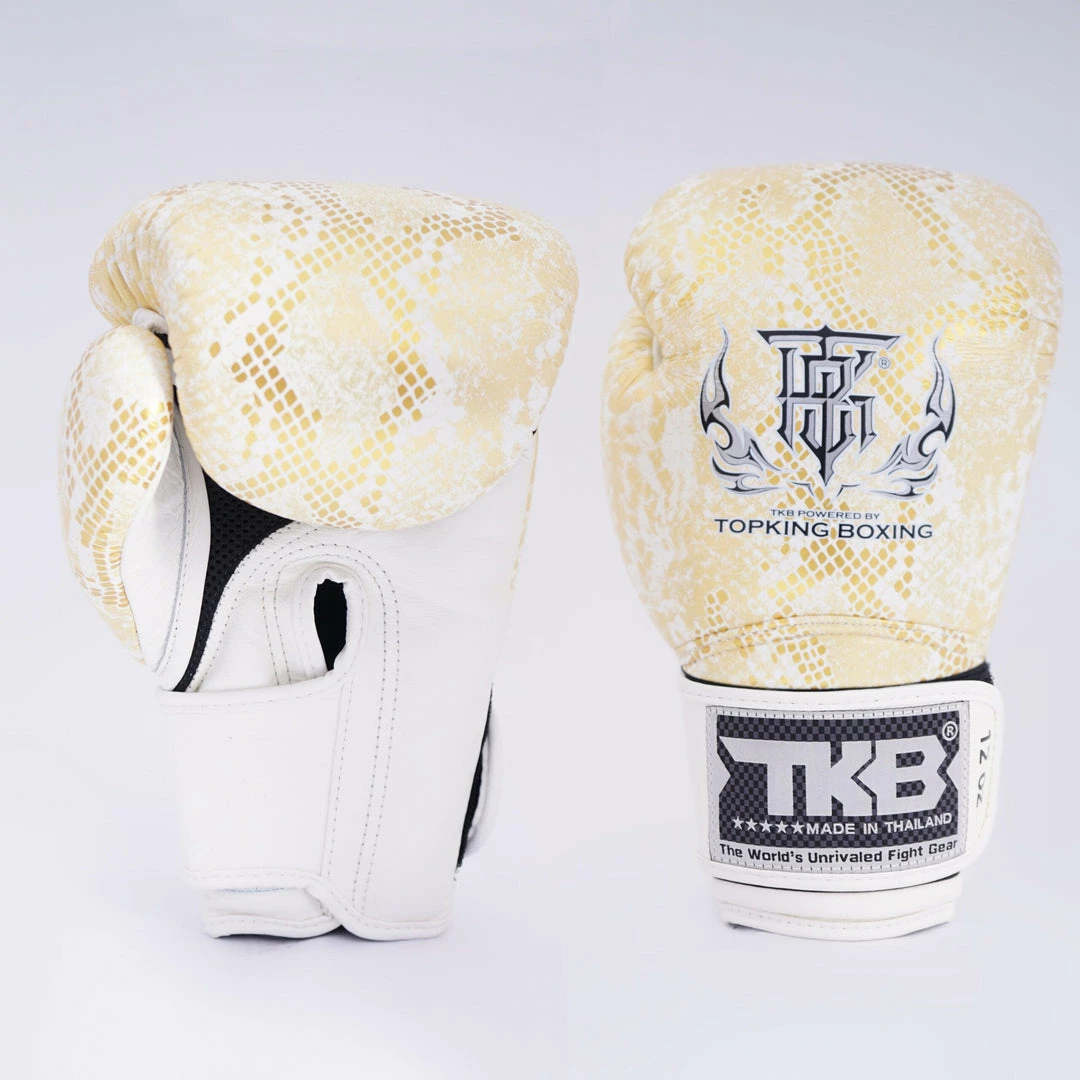 Top King Boxing Gloves Super Snake (TKBGSS-02) are handmade in Thailand from 100% cowhide leather. This collection is inspired by real snake skin and uses climacool technology for strategic ventilation to keep hands cool and dry. Many trainers and fighters use these gloves for Muay Thai and MMA training. Top King has a specially designed wraparound wrist strap that keeps the hook and loop closure in the correct position and closure system for a secure fit.
