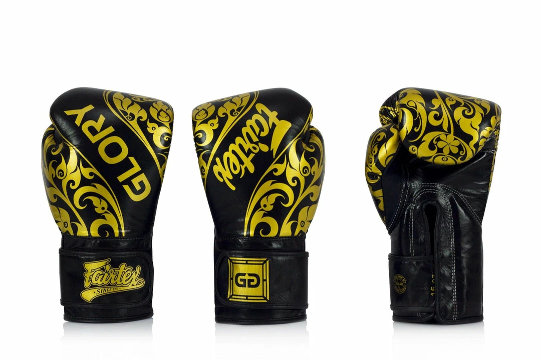 The Fairtex Glory BGVG2 boxing gloves are ย โ a special collaboration with traditional Thai artist Ruk Lertjitsakool. The artists is renowned for his work in traditional Thai art with his pieces displayed in temples across the Thailand. Similar to the BGVG1 version, the left and right glove feature slightly different designs. The left glove has Fairtex written on the back of the glove between the Thai design, with the Glory logo on the Velcro cuff. While the right glove has Glory written on the back of the glove and Fairtexโs logo on the cuff.