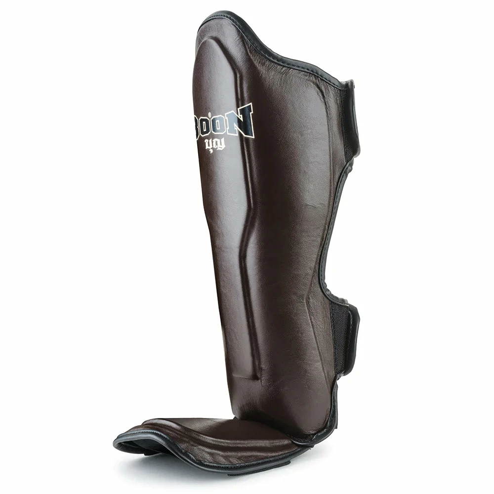 Boon Shin Guards are handmade in Thailand using premium top grain cowhide leather. These shin guards feature three layers of padding and a high cut at the knee to provide maximum protection.
